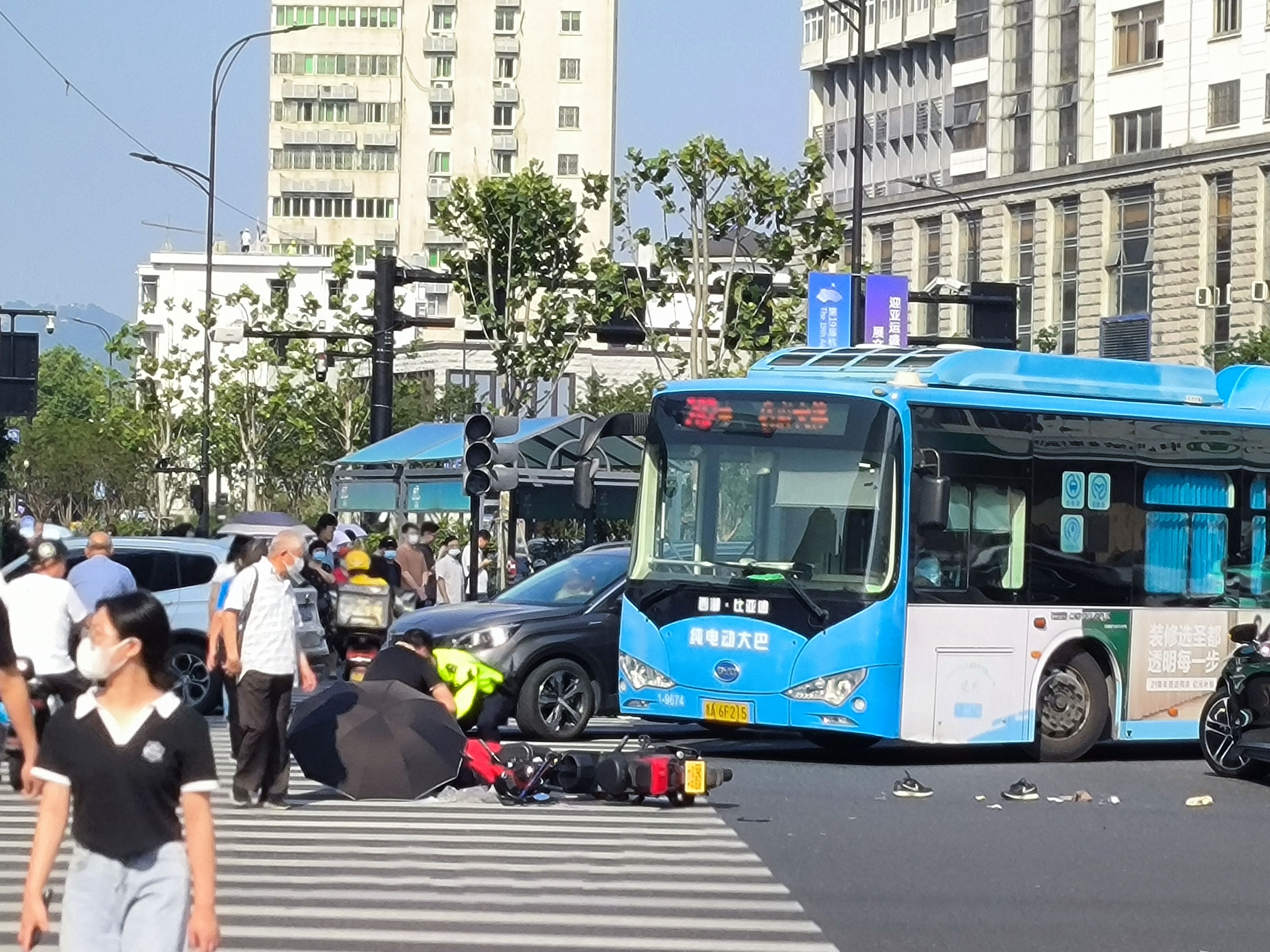 就在武林门地铁站 A 口旁,体育场路环城西路口的斑马线上,一辆电动车被撞倒在地,物品散落一地,车主被隐藏在遮阳伞下,不知状况如何。交警已经就绪,因为这里本是繁忙路口,高峰时段会有交警指挥交通,所以自然是迅速赶到现场。