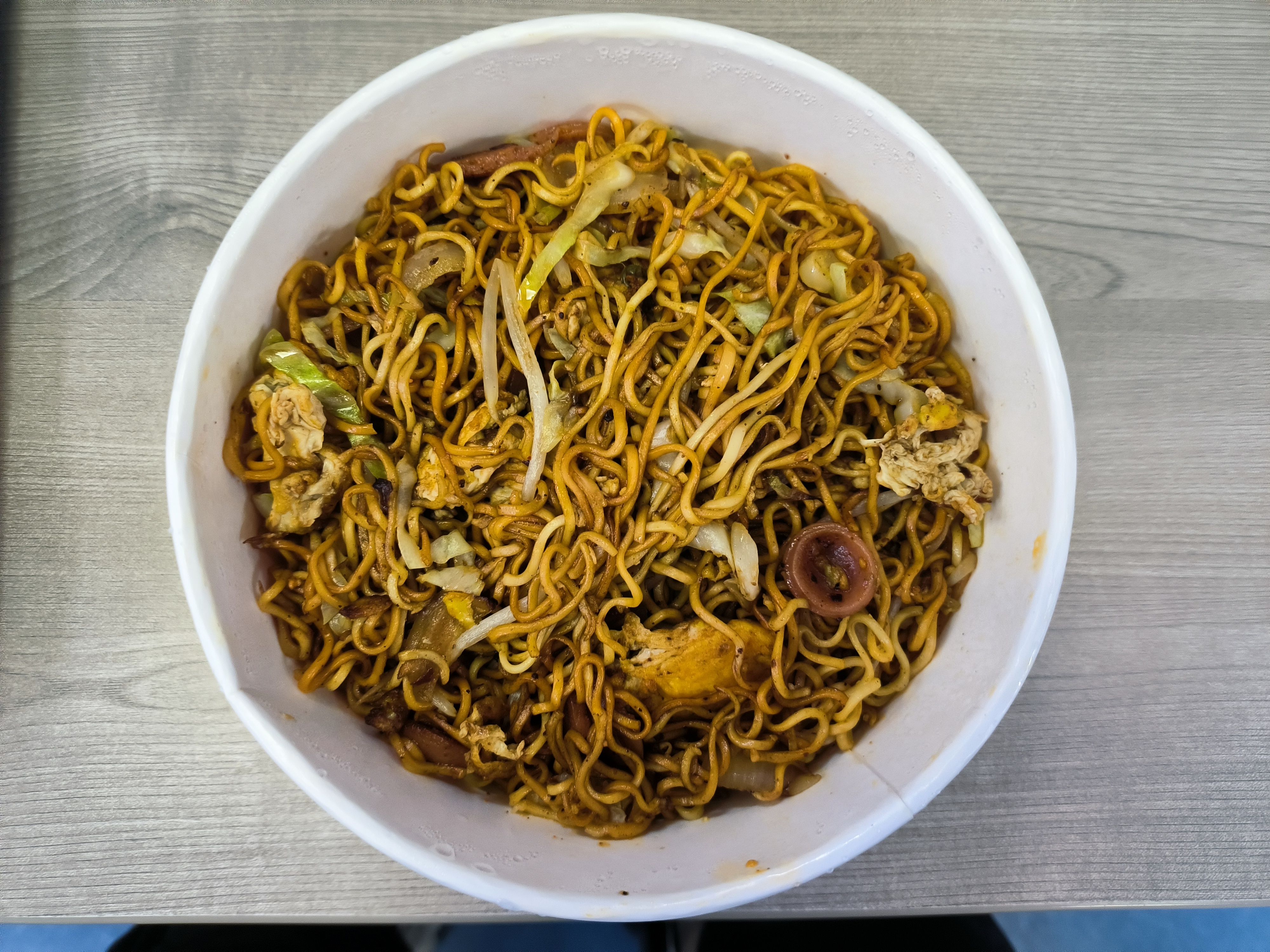 港式午餐肉煎蛋炒面。确实很港式,像是我在 CityU 吃的午餐的低配版(炒饭+两大块午餐肉+两个煎蛋+蔬菜,HK $23),当然价格也低配了。