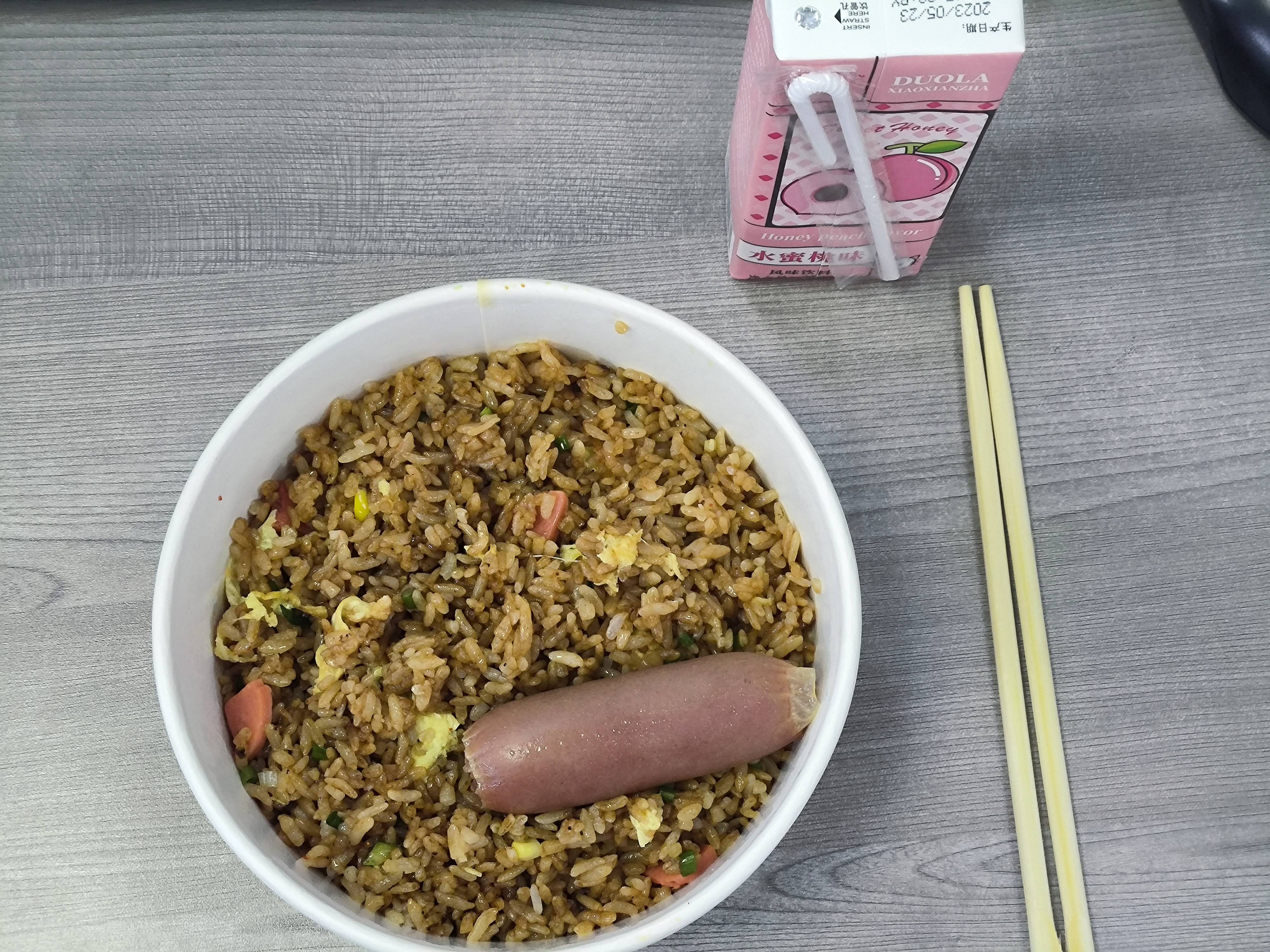 这份饭仅有的滋味在于加的两根火腿肠。剩下的不仅不够咸,还不够鲜,让人觉得好似炒冷饭。