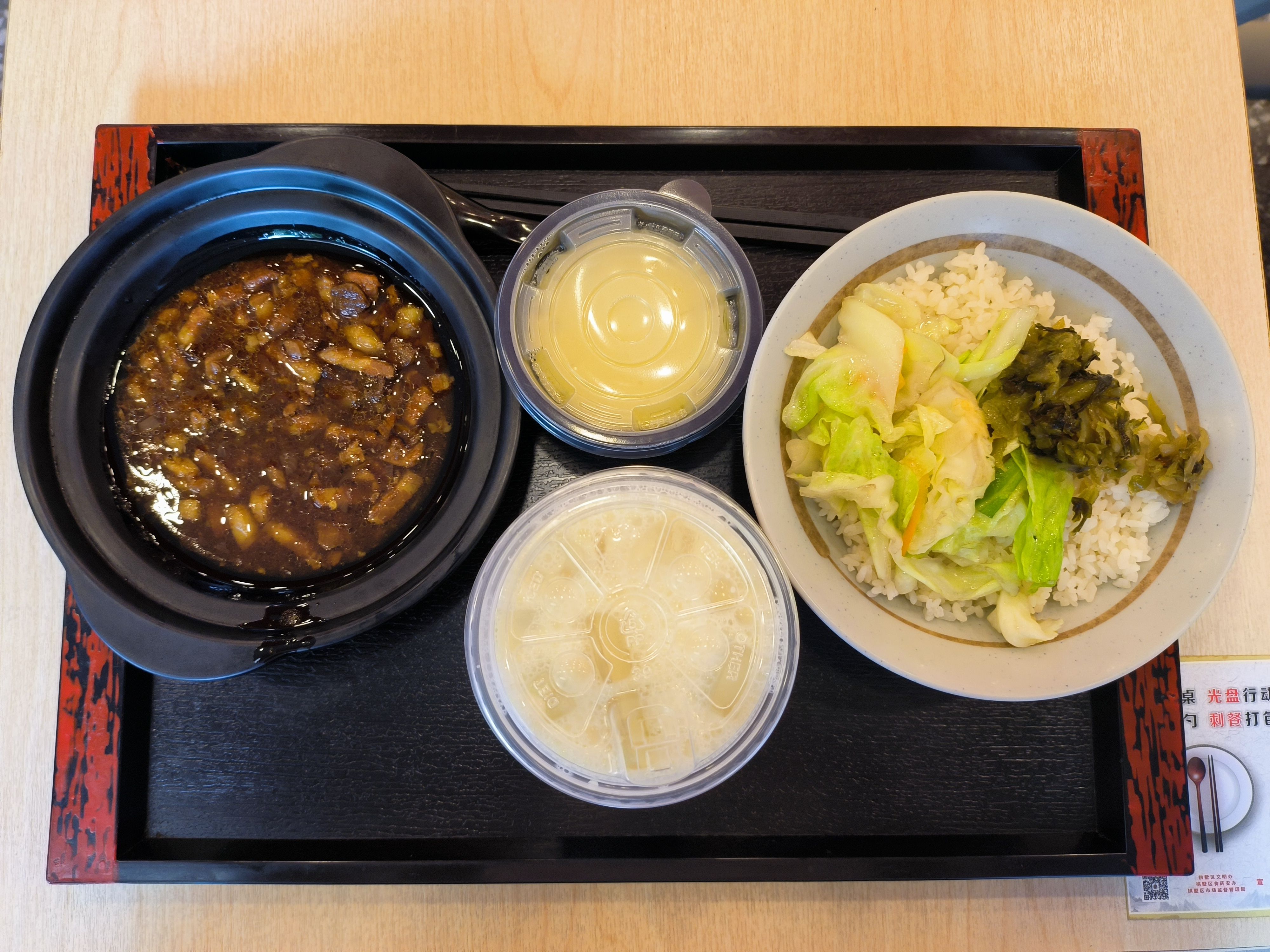 卤肉拌饭的卤肉不是那种炖得很烂的,而是切成小块的,但是肥瘦相间,肥肉的油脂和瘦肉的鲜味都很充分地融合在一起,吃起来很香。——Copilot 是这样评价的,看图来说确实不假。类似于学校食堂里的肉燥饭,但是后者太贵了,要 HK$ 28。豆浆——冰豆浆——其实并没有什么特色可言,不知道以豆浆作招牌的永和大王这么多年下来是不是变质了,不过总比真正意义上的祖传豆浆要健康吧……