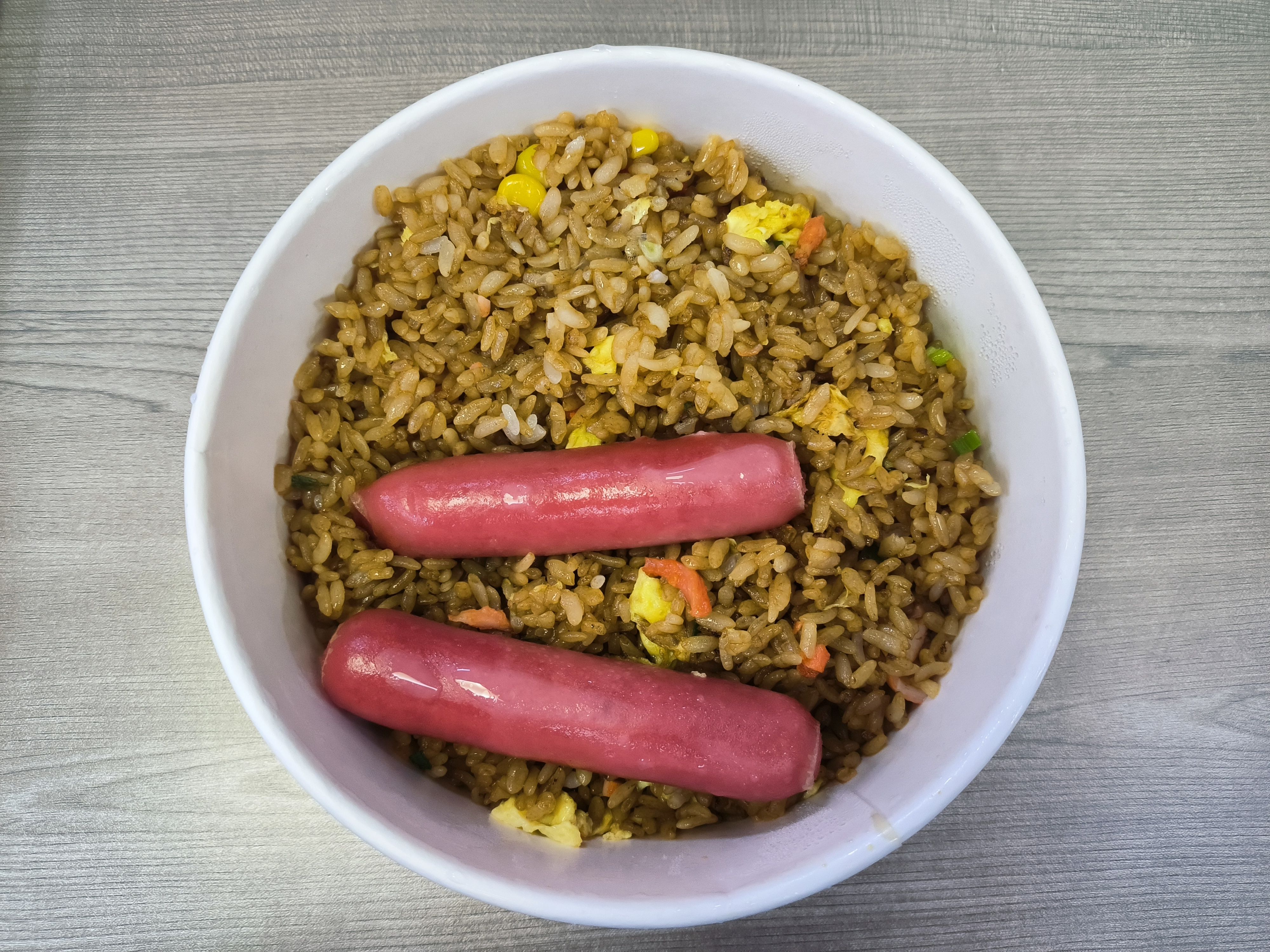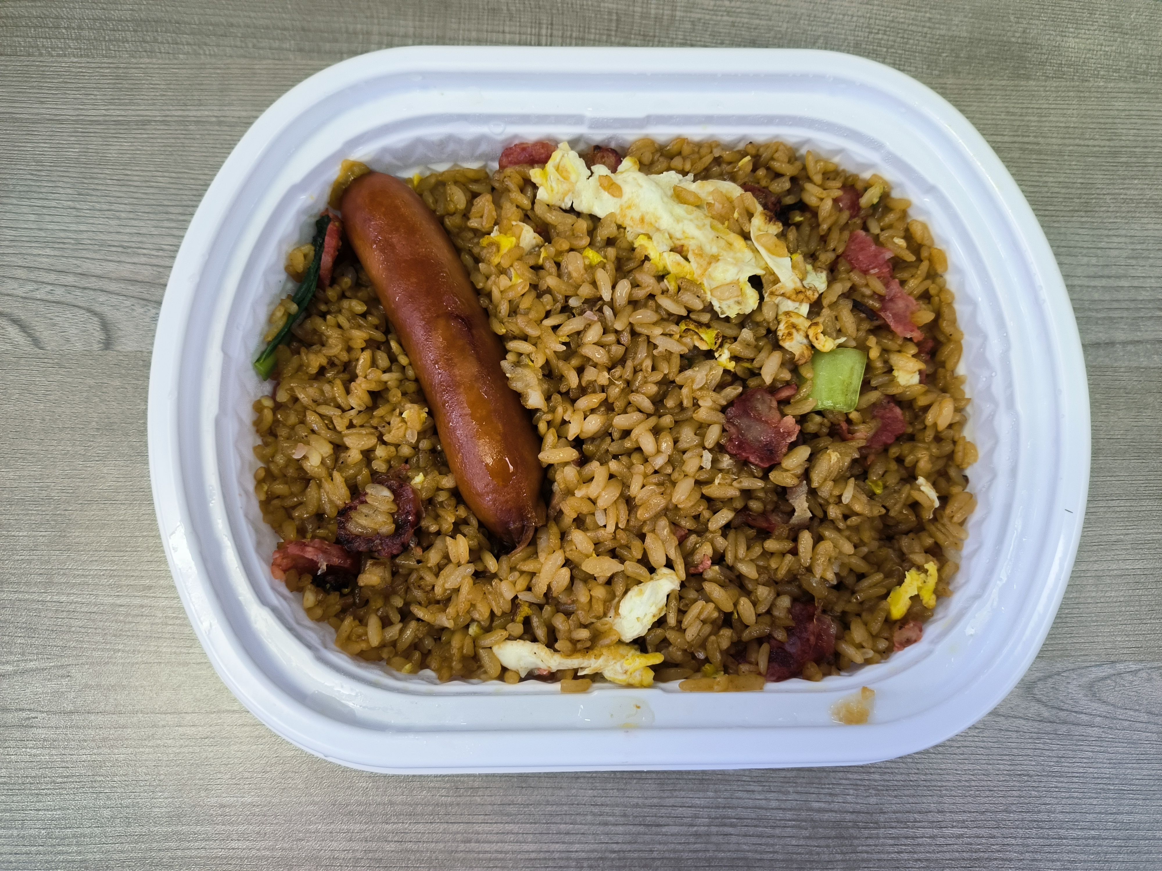 这份饭仅有的滋味在于加的两根火腿肠。剩下的不仅不够咸,还不够鲜,让人觉得好似炒冷饭。