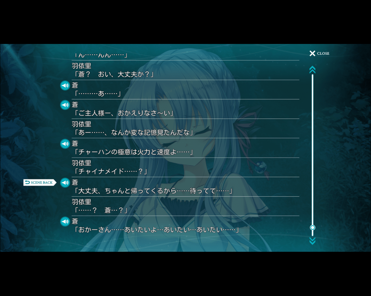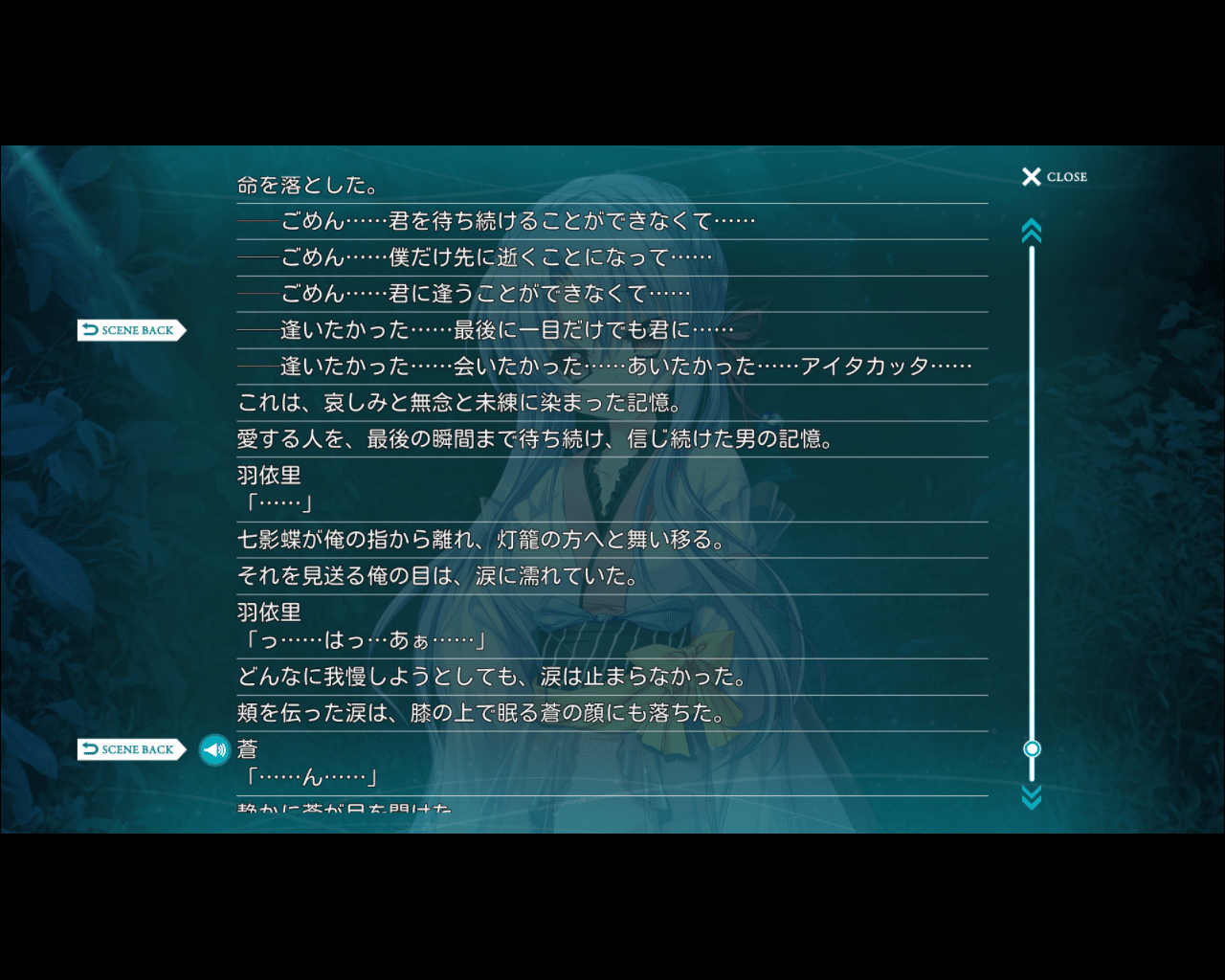 阅读故事期间,我一直恐惧着苍不知何时会陷入长眠。在野美希线中,苍非常担心羽依里可能被七影蝶困住无法从梦中醒来,并教给他脱离梦境的方法。苍本人一直在进行远超那种程度的鲁莽行为,这是显而易见的,而且镜子展示的古文书中也记载着「触碰七影蝶是禁忌」。