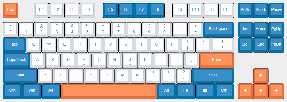 | 80% | 87 | 18.25u x 6.25u | 功能行 (13) + 主键区 (61) + 方向键 (4) + 导航区 (9) |